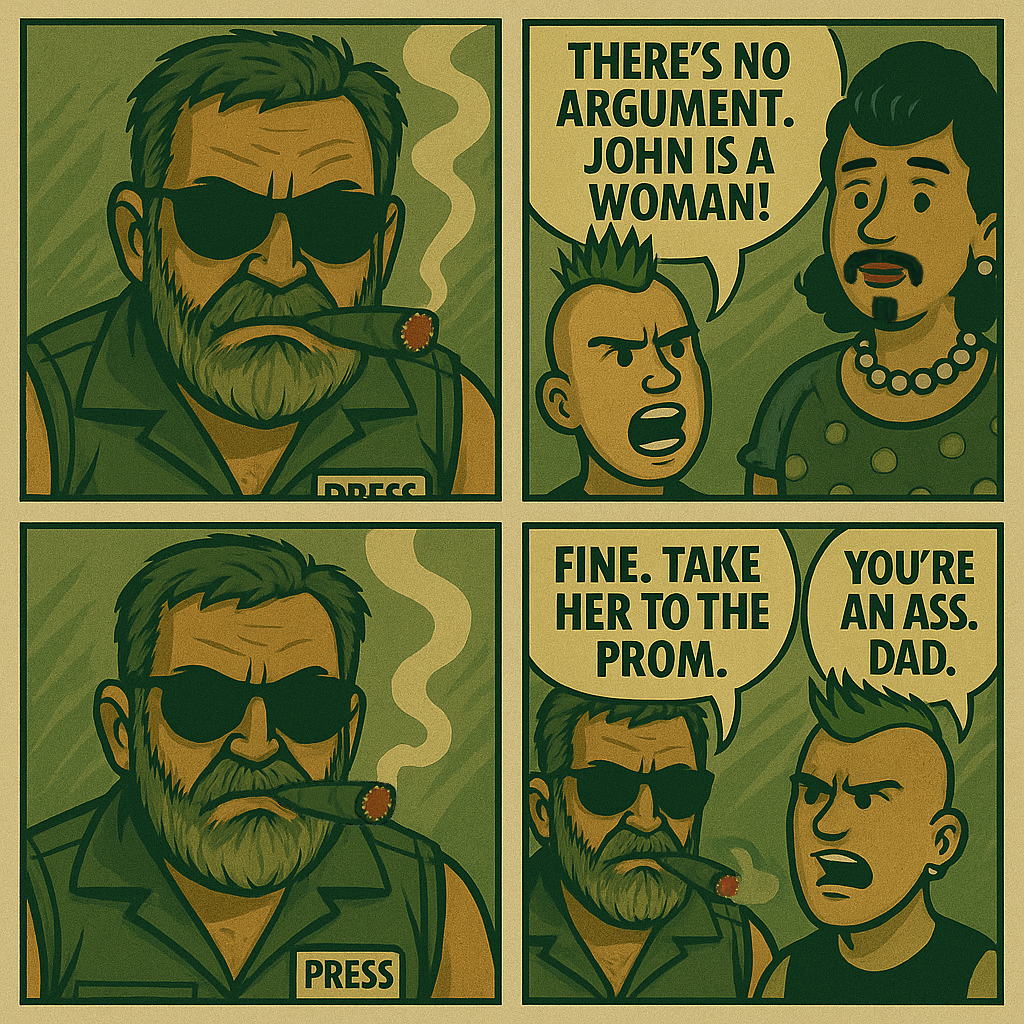 If the smell of burnt bridges and the whimper of trolls crushed by hard fact doesn’t faze you, saddle up. Ol’ Tin Cup and company high-five the devil while rolling through the culture wreckage and the hashtag wastelands — drunk, defiant, and three miracles short of sainthood.